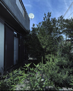 道路から丸見えになる居間の掃き出し窓を優しく覆う木々。上がベランダのため、家の中は暑いのですが、庭のこの木陰は涼しく、風に揺れる葉音も心地よいです。部屋からも揺れる木々を眺めることができ、高齢の両親の癒やしでもあります。