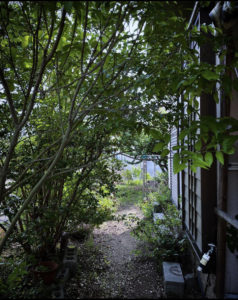 朝陽から夕陽まできっちり当たってしまう家。道路から丸見えになりそうな和室(写真左側)は大きな梅(奥)と槙(手前)で、リビング(写真右側)は、マートル、シマトネリコ、ギンモクセイなどなどで、木陰を作りつつ目隠しをする。木々の間からの優しい灯りと、塀がないことで開放的に。ご近所様とも目が合い、すぐにおしゃべりを始められる庭1と庭2です。