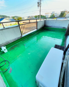 防水が剥げてるところは修繕し、排水トラップも少し改善が必要です。それができたら、敷き詰めていたウッドパネルを新調し、屋外用シンクを設置します。