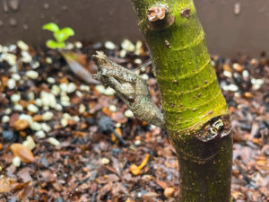 付近を探すと、隣のイチジクの木の根元で、サナギが1つ見つかりました。